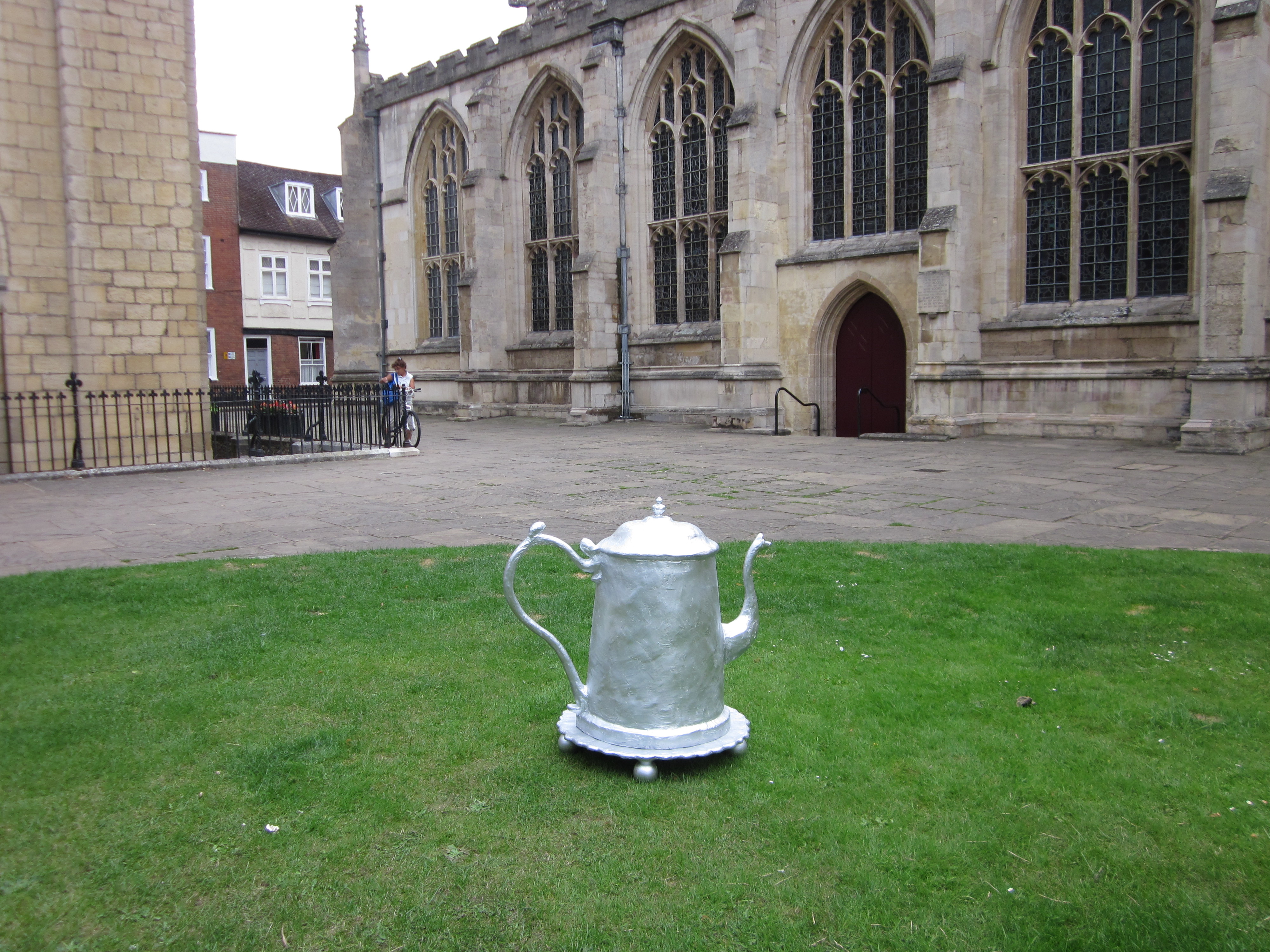 Letitia Rookes’ Silver Coffee Pot and Stand, 2014. ← Previous Next → Letitia Rookes’ Silver Coffee Pot and Stand, Site specific installation in The Great Churchyard, Bury St Edmunds, 2014. Pot: acrylic, plaster, wire, newspaper, plastic bin, marine ply, glue, wood, 87.5 x 94 x 65 cm. Photograph © Ceri Thomson 2014.